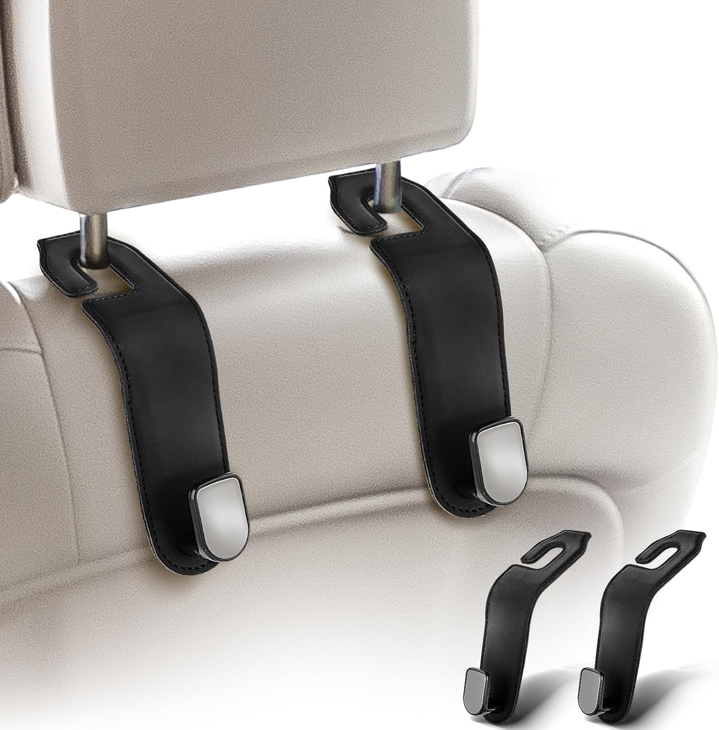 Instalação rápida: pendure o gancho do assento na barra do assento e ajuste o endereço, para frente ou para trás, você pode instalar facilmente esses ganchos sem remover o apoio de cabeça e sem ferramentas adicionais