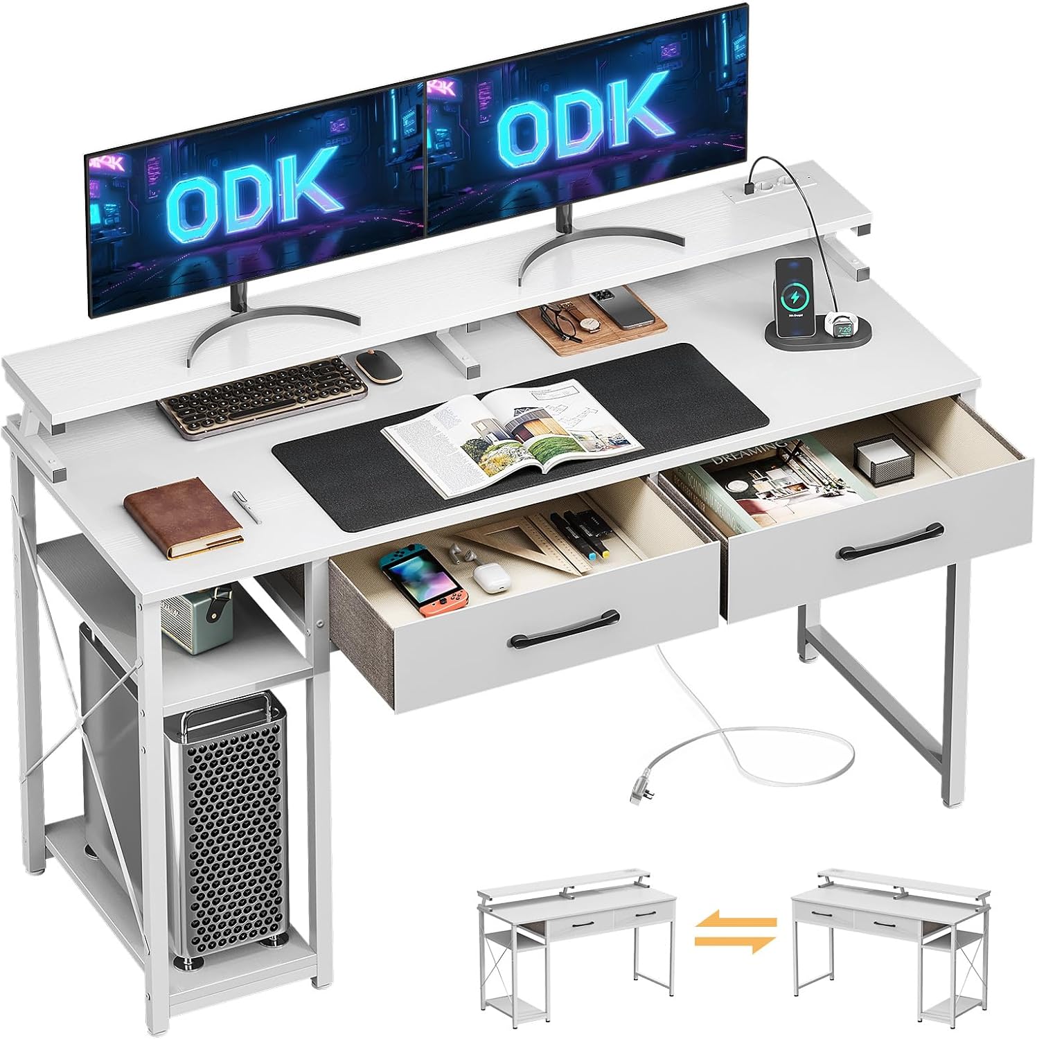 【Soquetes e portas de carregamento USB】 A mesa do computador ODK está equipada com 2 soquetes e 2 portas de carregamento USB para seus dispositivos eletrônicos. Assim, você pode carregar seu smartphone, console de jogos ou dispositivos Bluetooth de maneira fácil e conveniente enquanto trabalha ou se diverte.