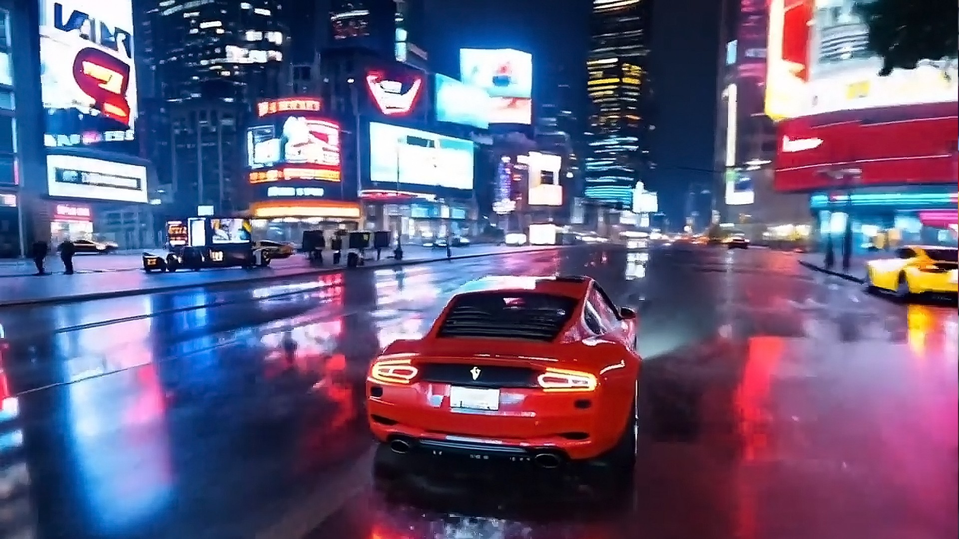 O vídeo começa mostrando o jogador dirigindo uma Ferrari modificada em terceira pessoa numa avenida repleta de prédios com vários painéis de LED que se destacam na noite com seus reflexos no asfalto molhado.