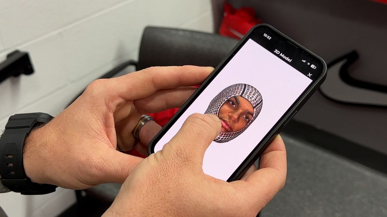 Ries mostra uma varredura da cabeça de um jogador em busca de um capacete personalizado. (Notícias do Espectro 1/Katie Kapusta)