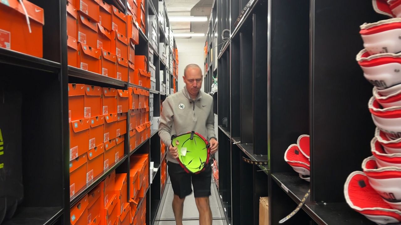 Kevin Ries encontra um boné de guardião na sala de equipamentos do Woody Hayes Athletic Center. (Notícias do Espectro 1/Katie Kapusta)